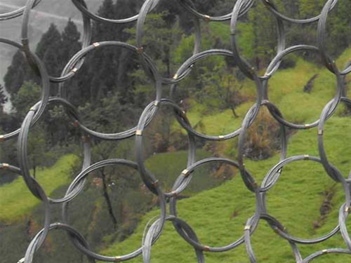 產(chǎn)品特性:用數(shù)股鋼絲盤結(jié)成環(huán)形相互套接而形成的網(wǎng)。其作用是攔截落石防護能量一般為150kj--2000kj。