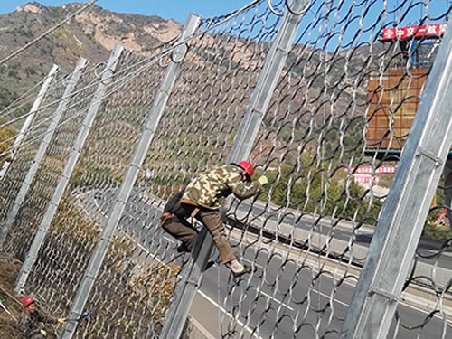 常用規(guī)格:[鋼柱(間距10M),帶消能環(huán)的∮16雙支撐繩和∮16“人”字形上拉錨繩(每跨6個消能環(huán)),∮16側(cè)拉錨繩(單繩),◇/08/200/4*5㎡鋼絲繩網(wǎng),∮8縫合繩,格柵網(wǎng)]