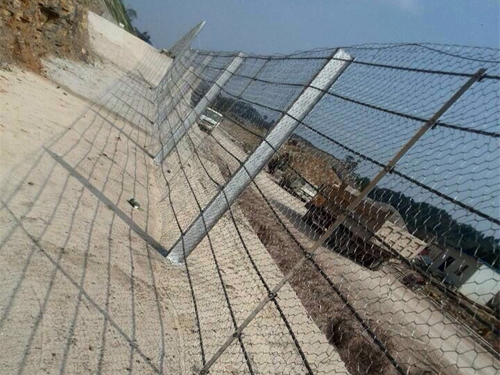 鋼性防護(hù)網(wǎng)各種部件連接均簡(jiǎn)單有效,且應(yīng)考慮施工方便與易于更換,便于后期的維修管理,鋼絲繩與端柱與端柱采用端柱索具連接,鋼絲繩與中間鋼柱及間距保持板采用U型螺栓連接,鋼絲格柵與鋼絲繩采用2.0扎絲綁扎,這樣便于后期維護(hù)性更方便